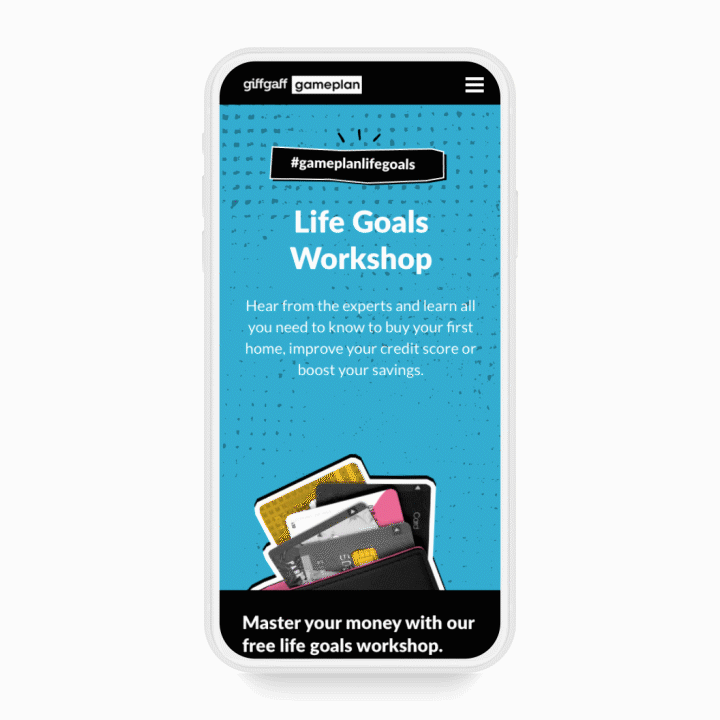 Life goals workshop. The brief was to create a landing page, event banners and signage. At the same time utilising the giffgaff brand and furthering brand awareness.